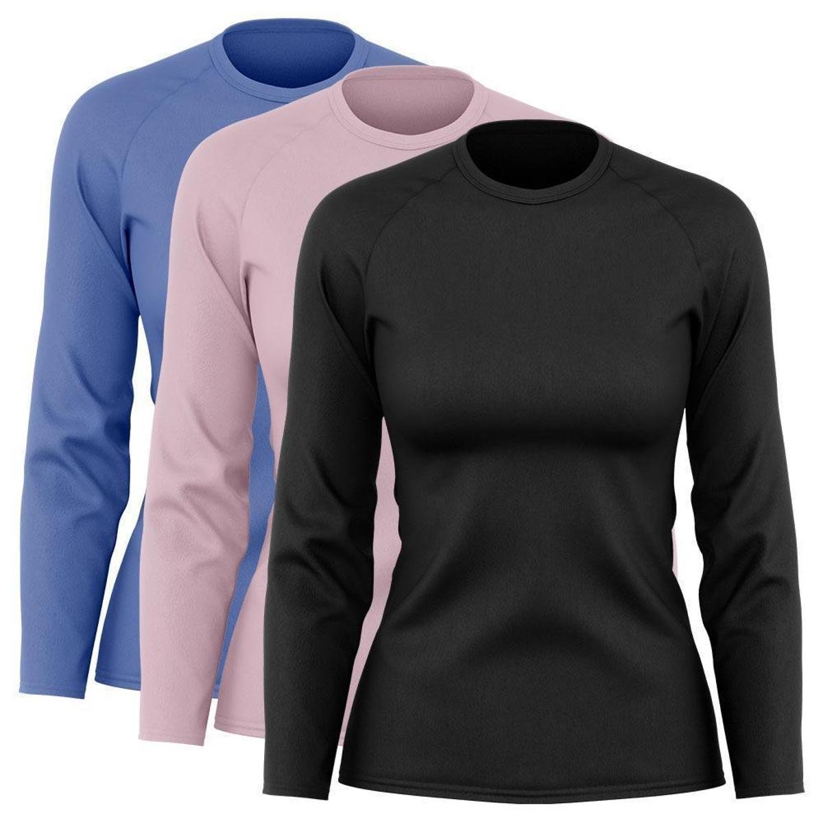 Kit 3 Blusas Via Basic Dry Academia Segunda Pele Manga Longa Proteção Solar UV Feminina