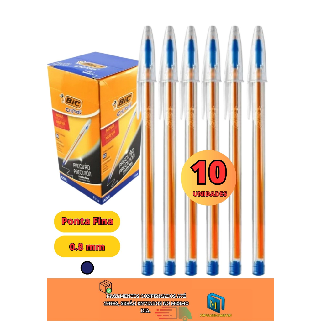 CANETA BIC PONTA FINA CRISTAL 0.8MM, KIT COM 10 UNIDADES