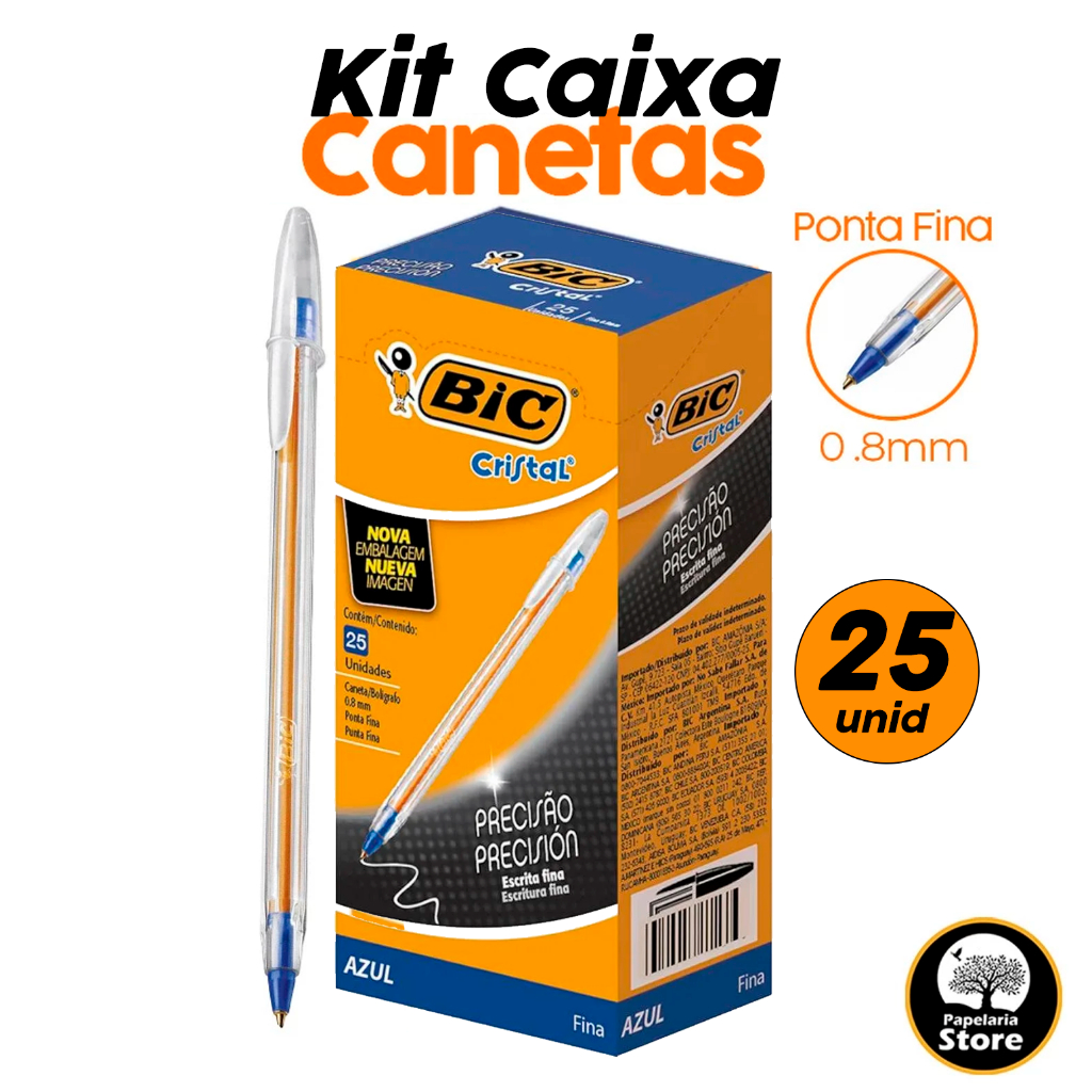 Kit Caixa Caneta Bic Fina Cristal Alta Precisão 0.8mm Azul Com 25 Unidades