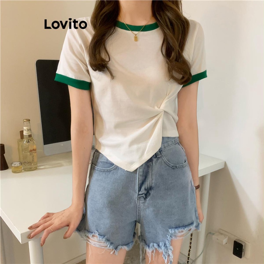 Lovito Camiseta Feminina Plissada Casual Patchwork Contrastante LNE43268
