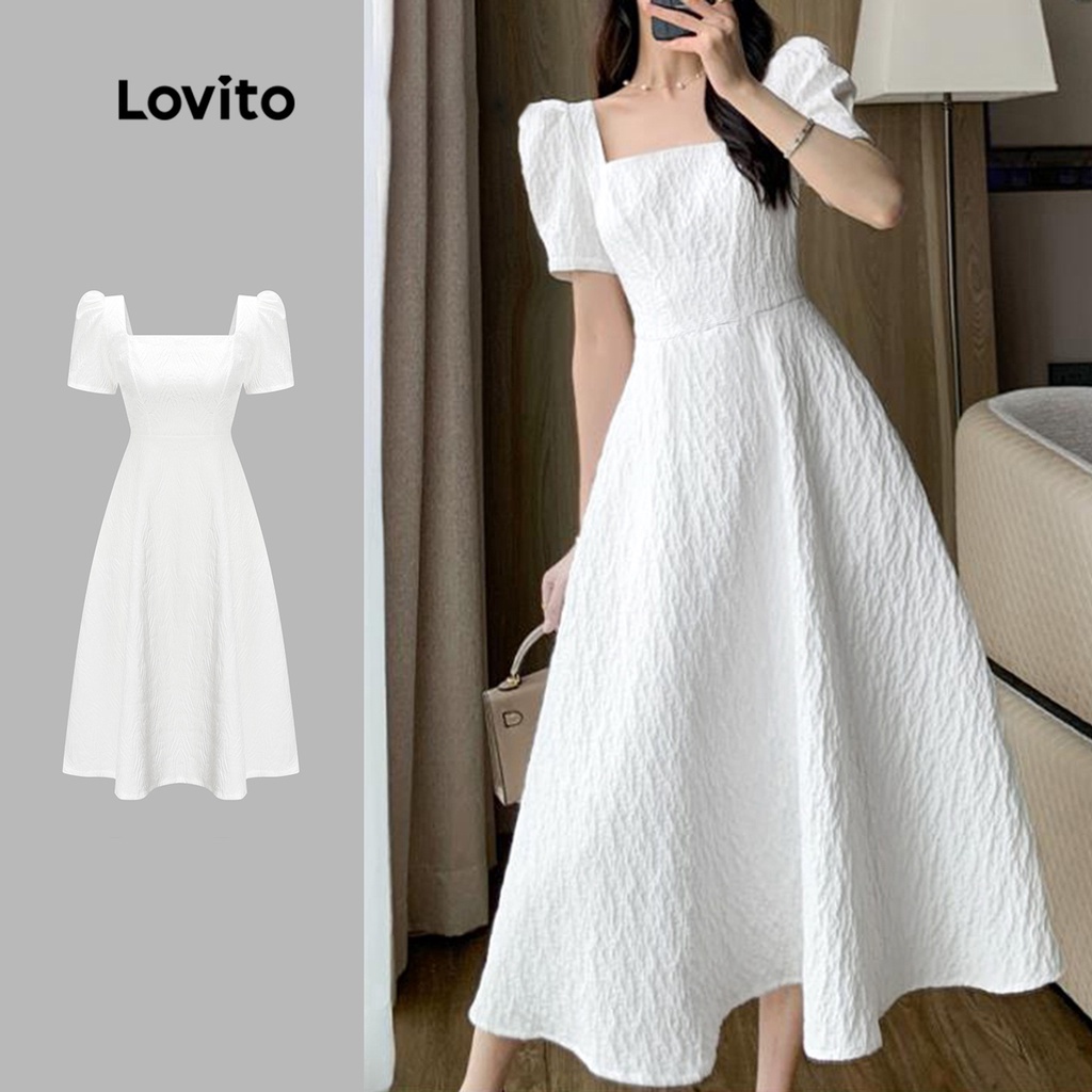 Lovito Elegante Liso Vestido Feminino de Manga Bufante e Gola Quadrada L65ED170 (Branco)