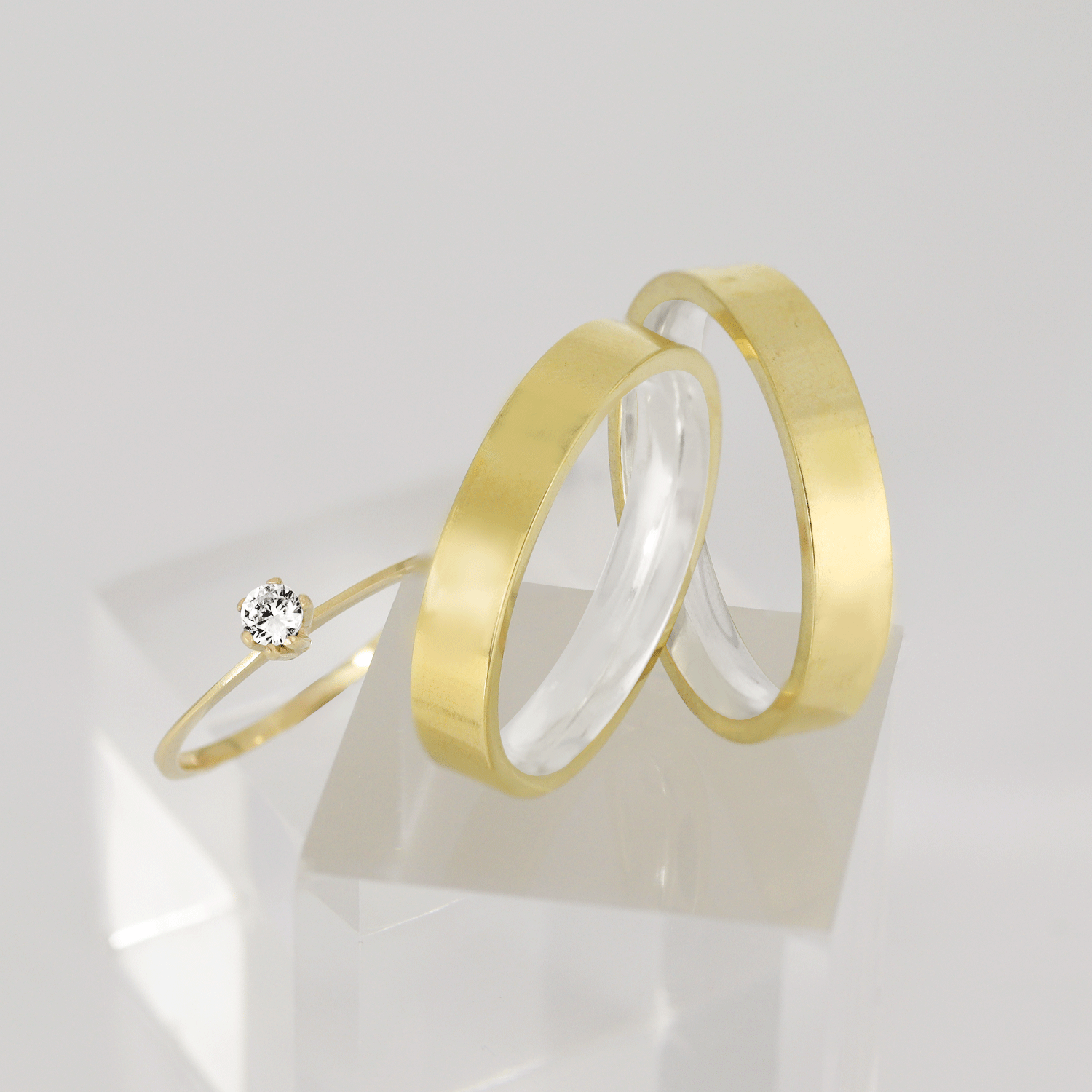 Kit de Alianças Douradas Chanfradas Com Anel Solitário Noivado Casamento 2 Tamanhos