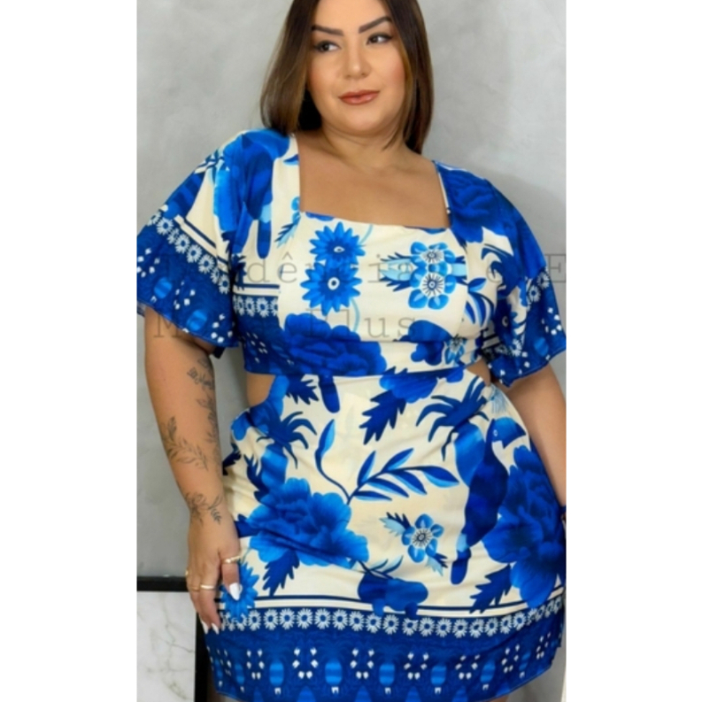macaquinho vestido em tendencia estilo moda plus size estampa azul possui bojo