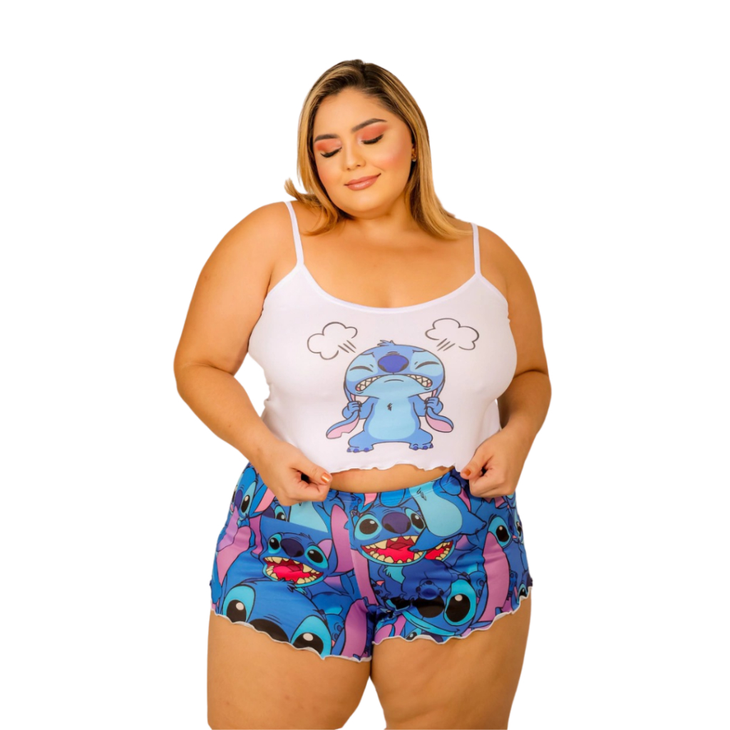 Pijama Plus Size Feminino Stitch Curto Ondinha Virginia Cropped Baby Doll Short Doll