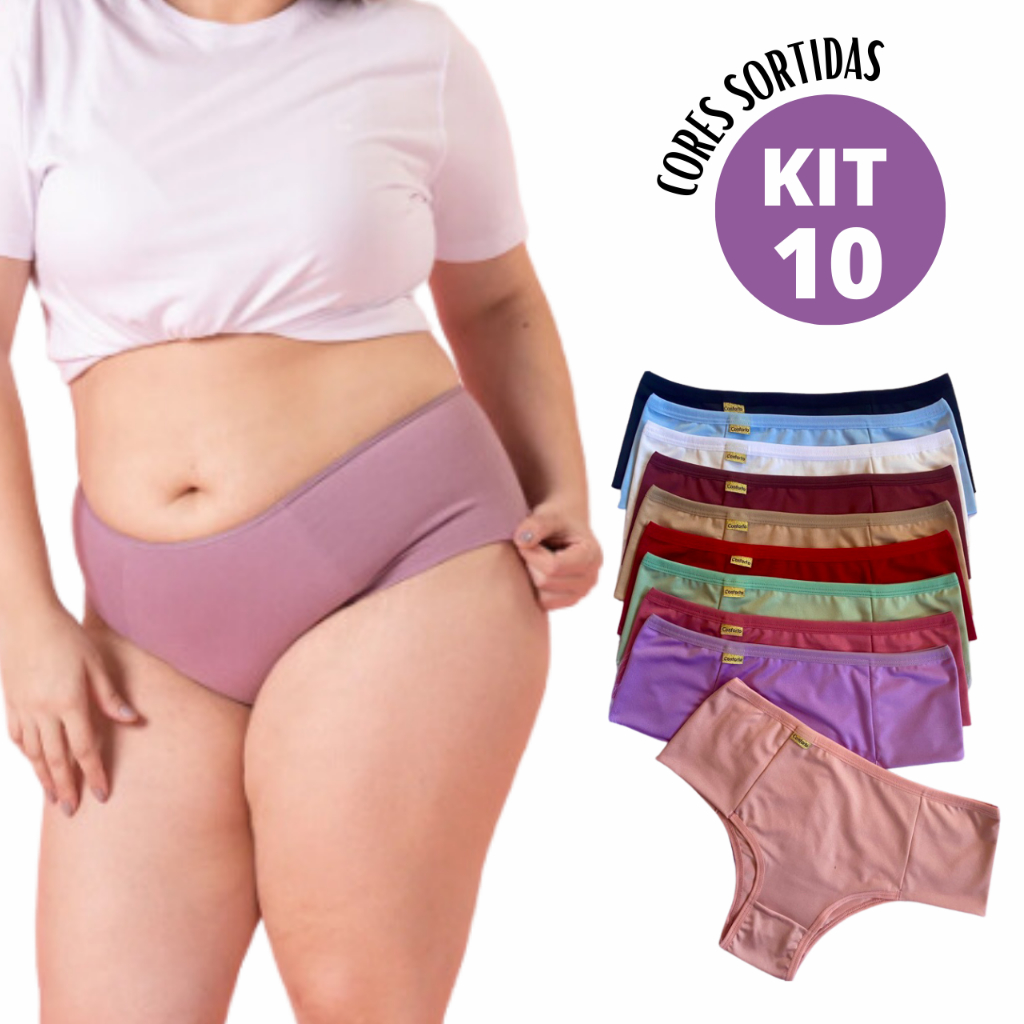 KIT 10 Calcinhas Ruth Microfibra Adulto Confortável Pala Dupla Cintura Alta Cores Variadas Feminina