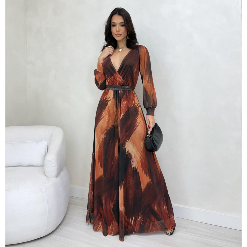 Macacão Longo Feminino Pantalona Tule Estampado Forrado Manga Longa Decote em V Elegante