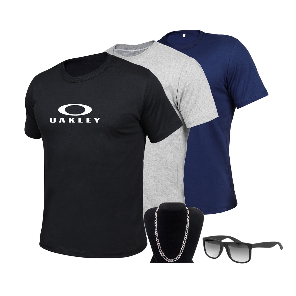 Kit camisetas masculinas 3 peça slim estampada 100% algodão + óculos de sol + corrente cor prata