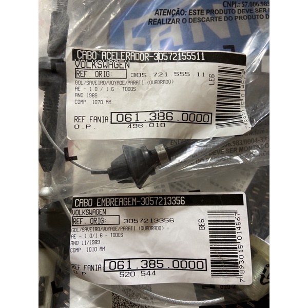 kit Cabo Acelerador Embreagem Gol Quadrado 1.0 1.6 CHT Todos 1989 em diante Fania 61386 61385