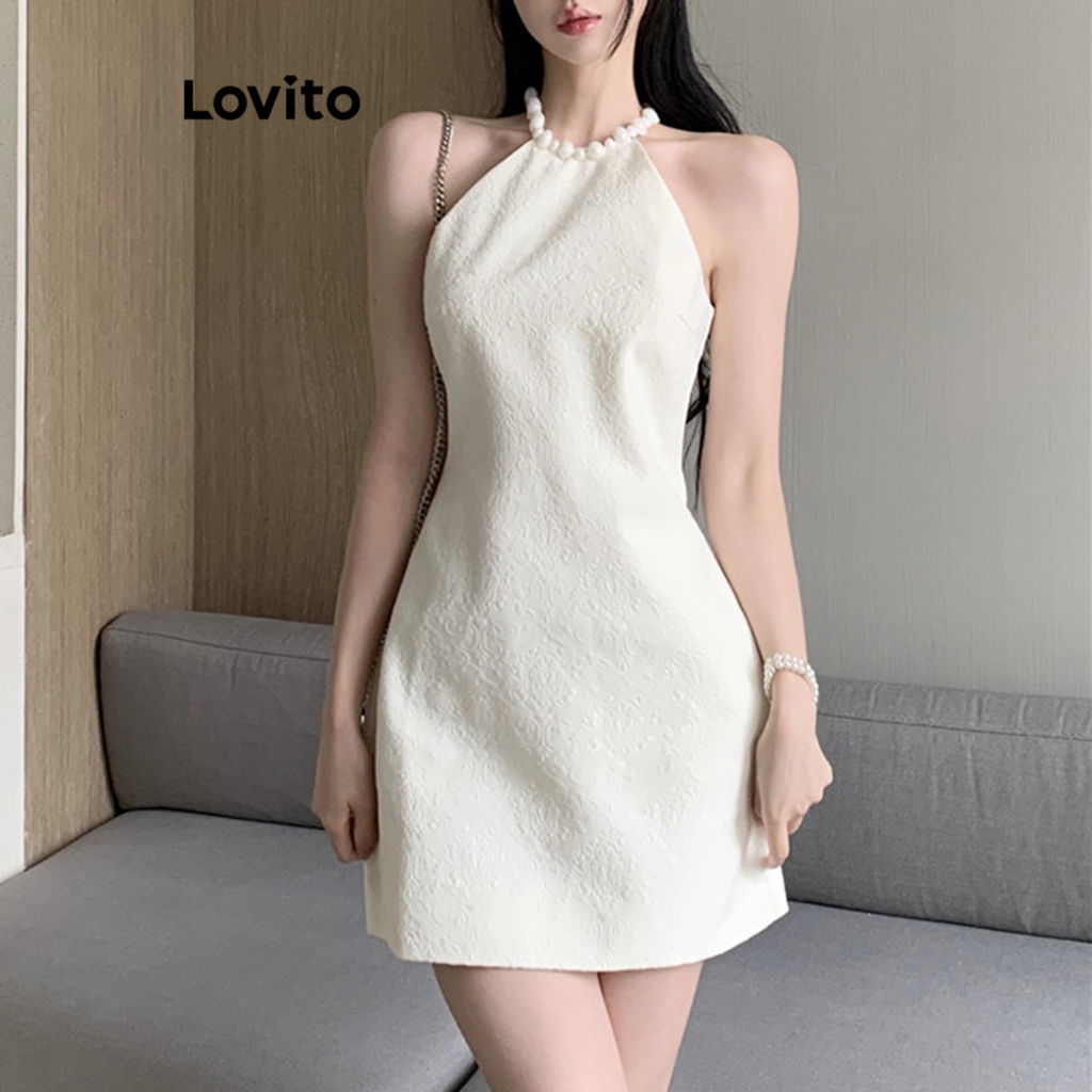 Lovito Casual Vestido Feminino Liso com Pérolas LNE33141 (Off White)
