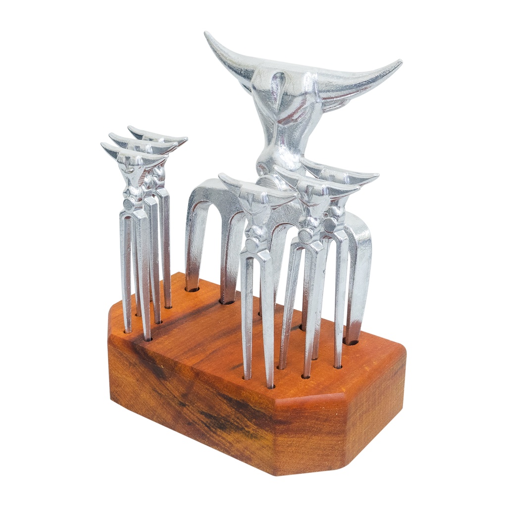 Kit Garfo 5 Dentes Cabeça de Boi Churrasco 6 Garfinhos Petisco Suporte em Madeira