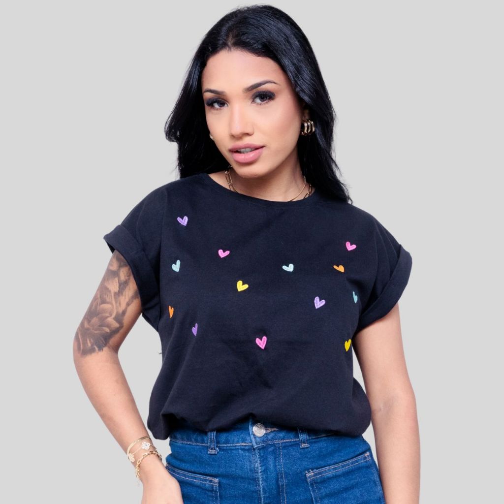 Blusa T-Shirt Feminina Camiseta Basica Algodão Manga Japonesa Cereja Bordado