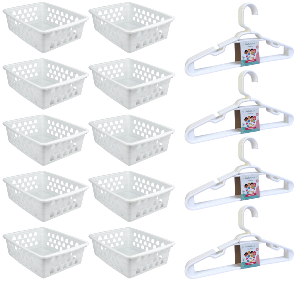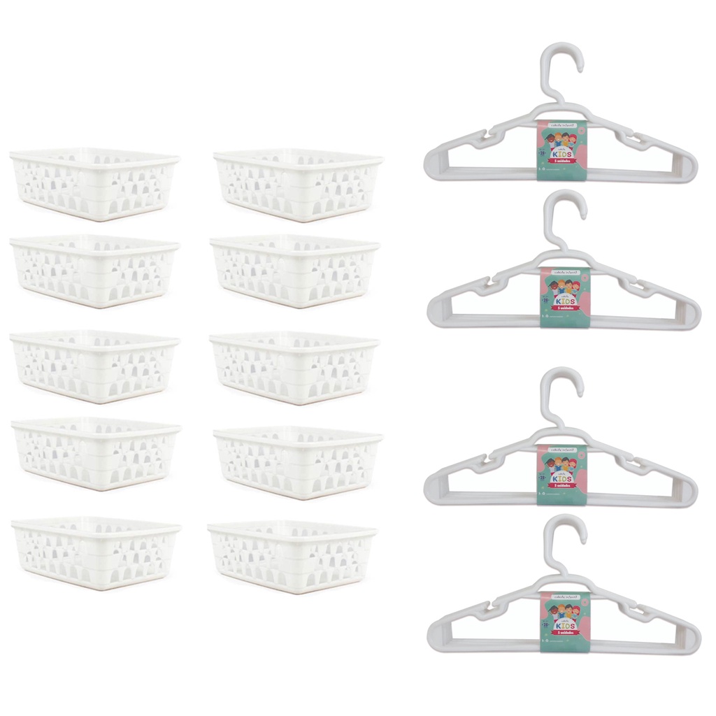 Kit 10 Cestos Organizador Pequeno 16x12x6Cm Branco + 20 Cabides Branco Infantil