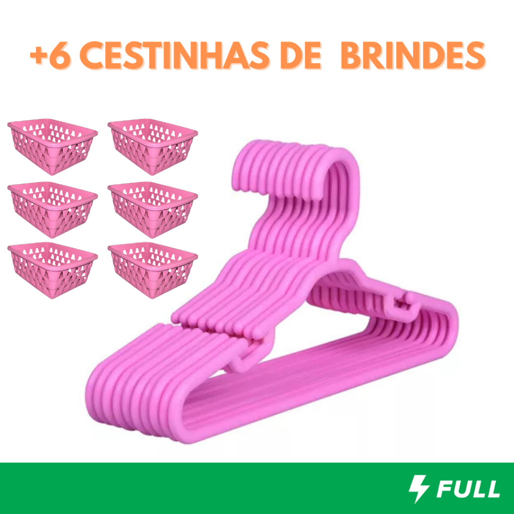 Kit Organizador 10 Cabides Infantil e 6 Cestos Brinde Branco Rosa Azul