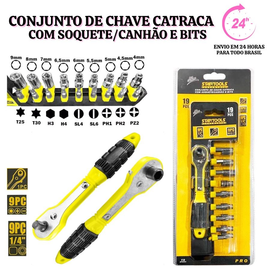 Jogo Chave Catraca Com Soquetes Kit 19 Peças Tipo Canhão E Bits Uso Geral Mini Kit Reparo Casa