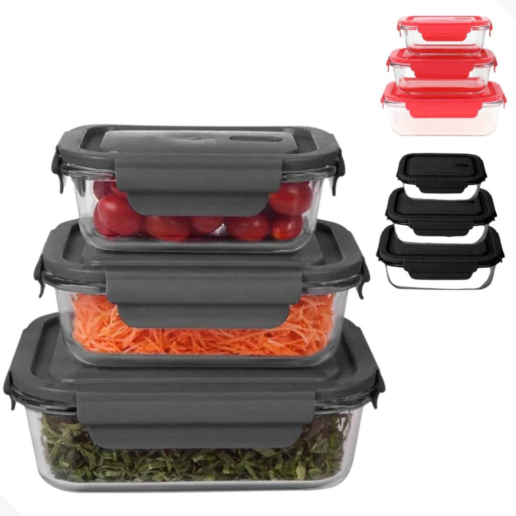 Jogo De Potes Tigela Em Vidro Com Tampa 3 peças Hermetico