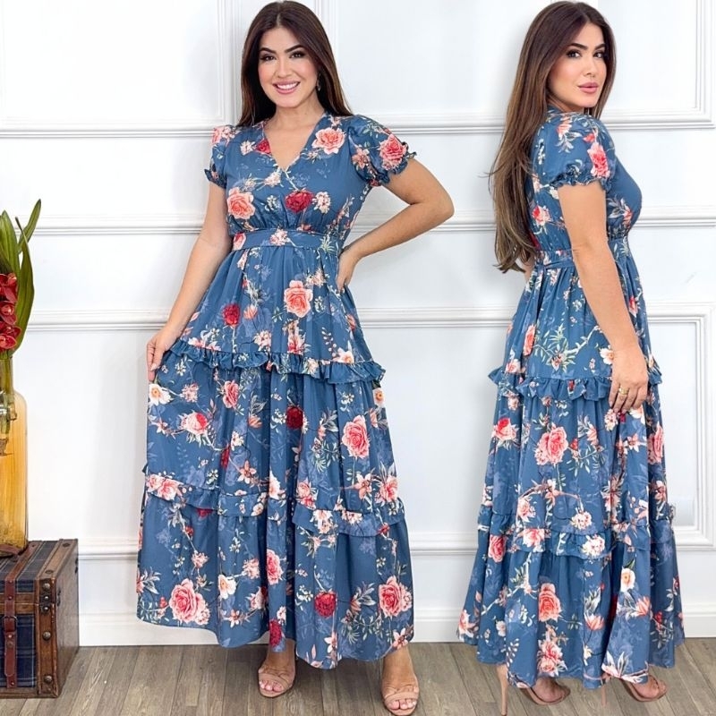 Vestido Longo Feminino Duna Verão Moda Evangélica Com Lastex na Cintura Ref 5 A