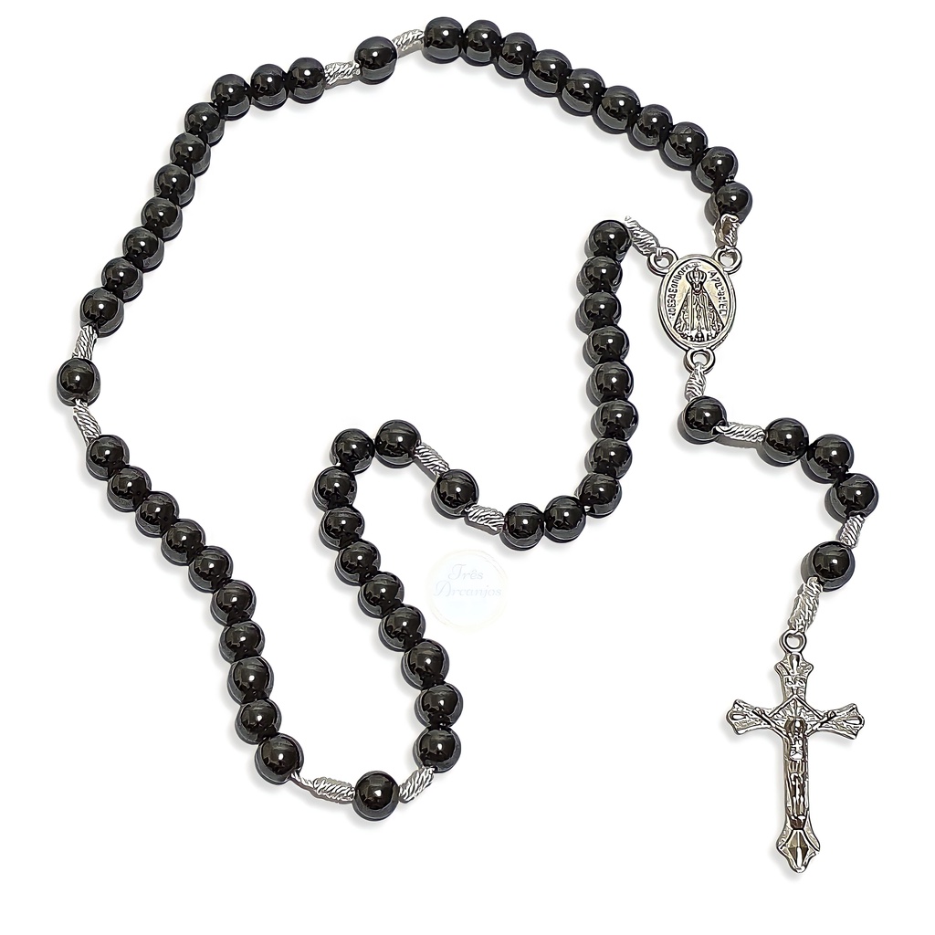 Terço Hematita Cordão Com Fecho Medalha Nossa Senhora Aparecida E Crucifixo Em Metal