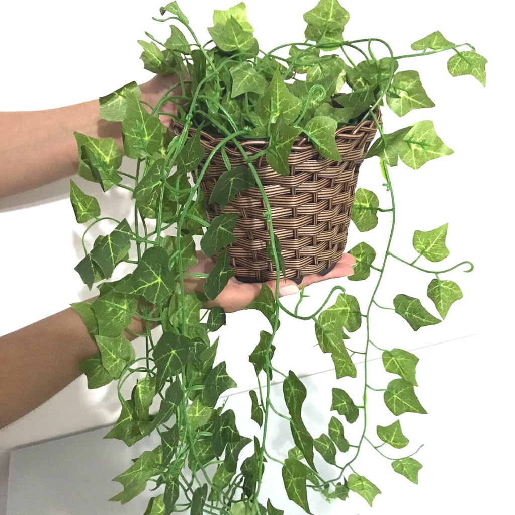 Kit 1 Arranjo Planta Decorativa + Vaso Trançado Marrom 3 Pendentes Artificial Folhas De Hera