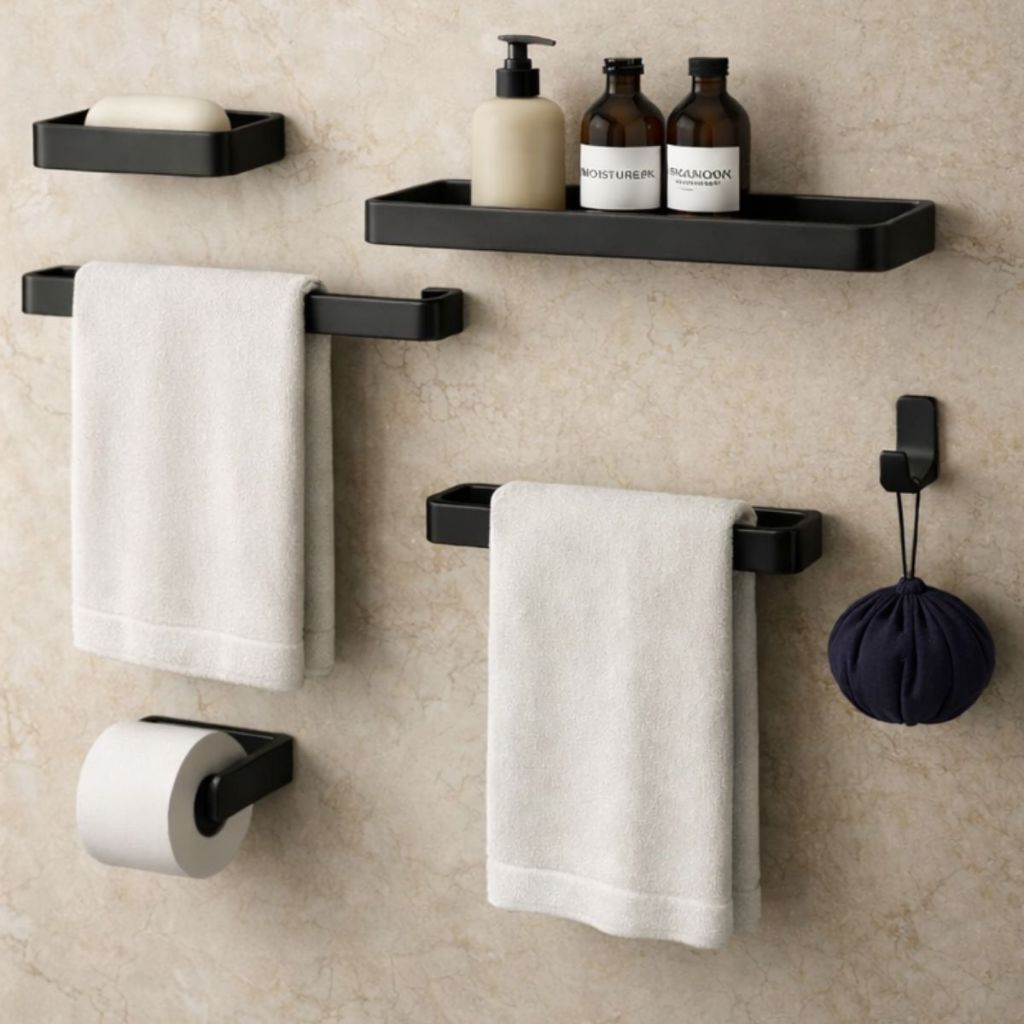 Kit Acessórios Para Banheiro Lavabo 6 Peças Toalheiro Inox Premium Suporte Parede Luxo Preto Cromado