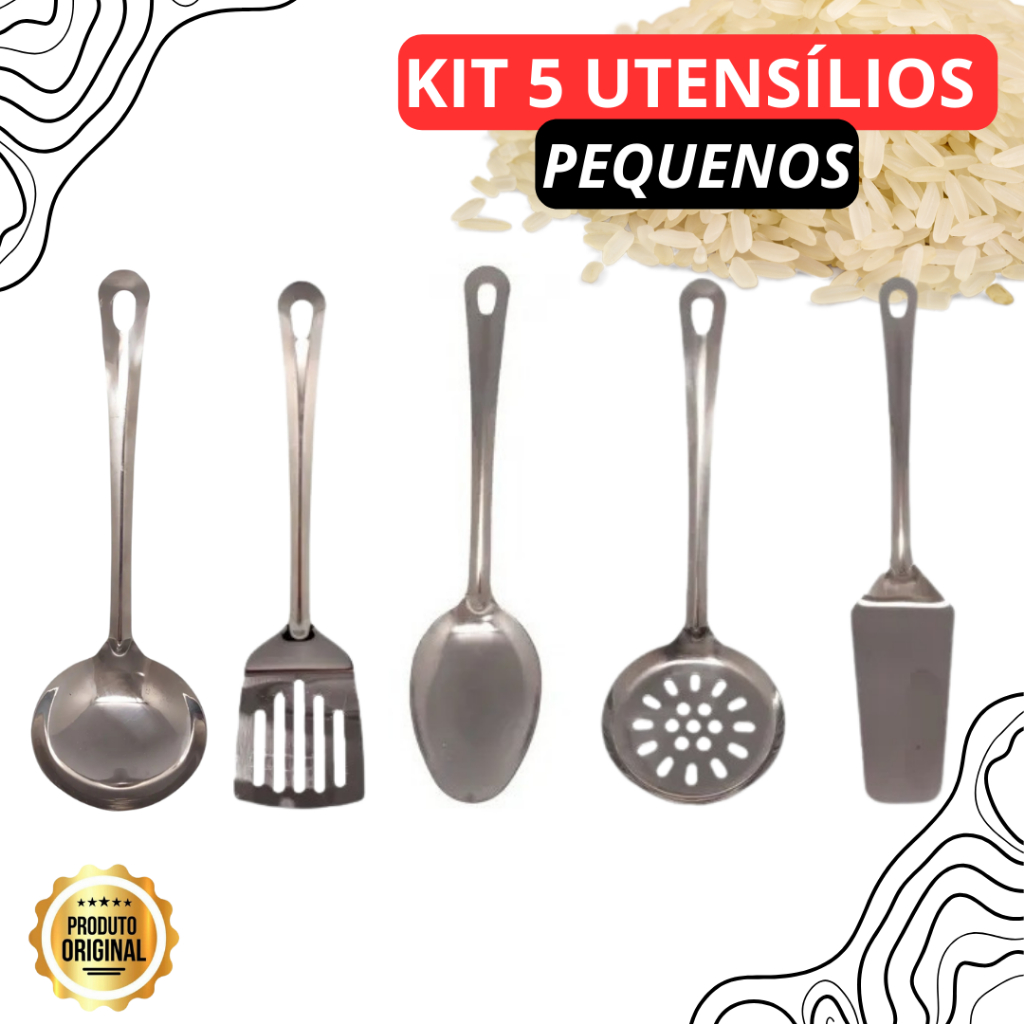 Kit 5 Utensílios 100% Inox Para Cozinha - Concha, Colher de Arroz, Espatula , Espatula Vazada - Escumadeira De Alta Qualidade