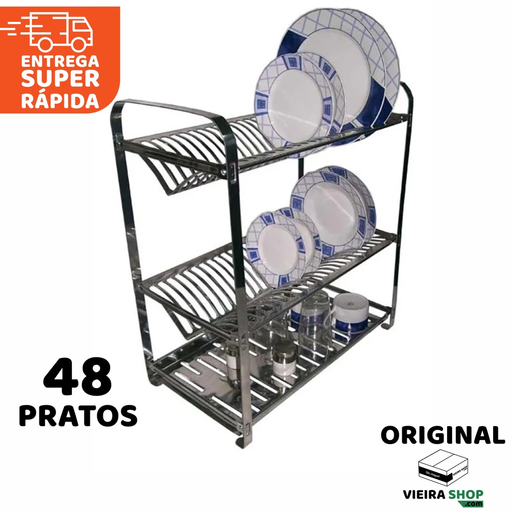 Escorredor De Pratos Grande Aço Inox 48 Pratos Prático Não Enferruja Três Andares
