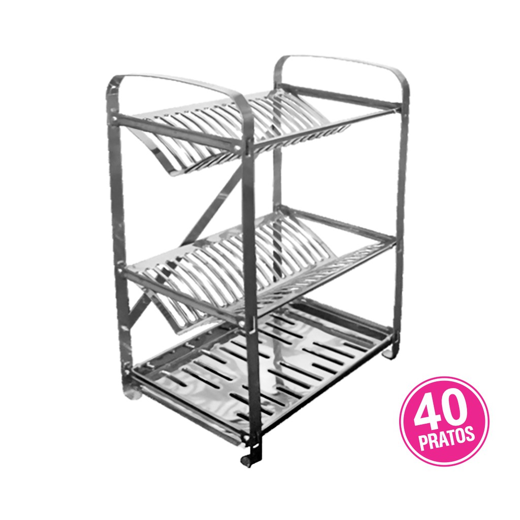 Escorredor De Louça Grande Aço Inox 40 Pratos Três Andares Não Enferruja