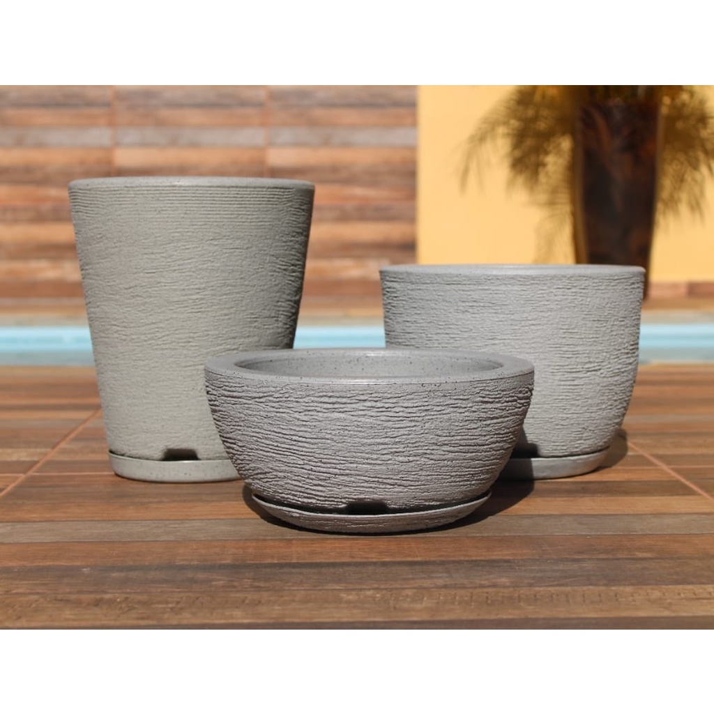 Kit 3 Vasos Para Plantas Polietileno Texturizado Redondo Cone + Bojo + Bacia