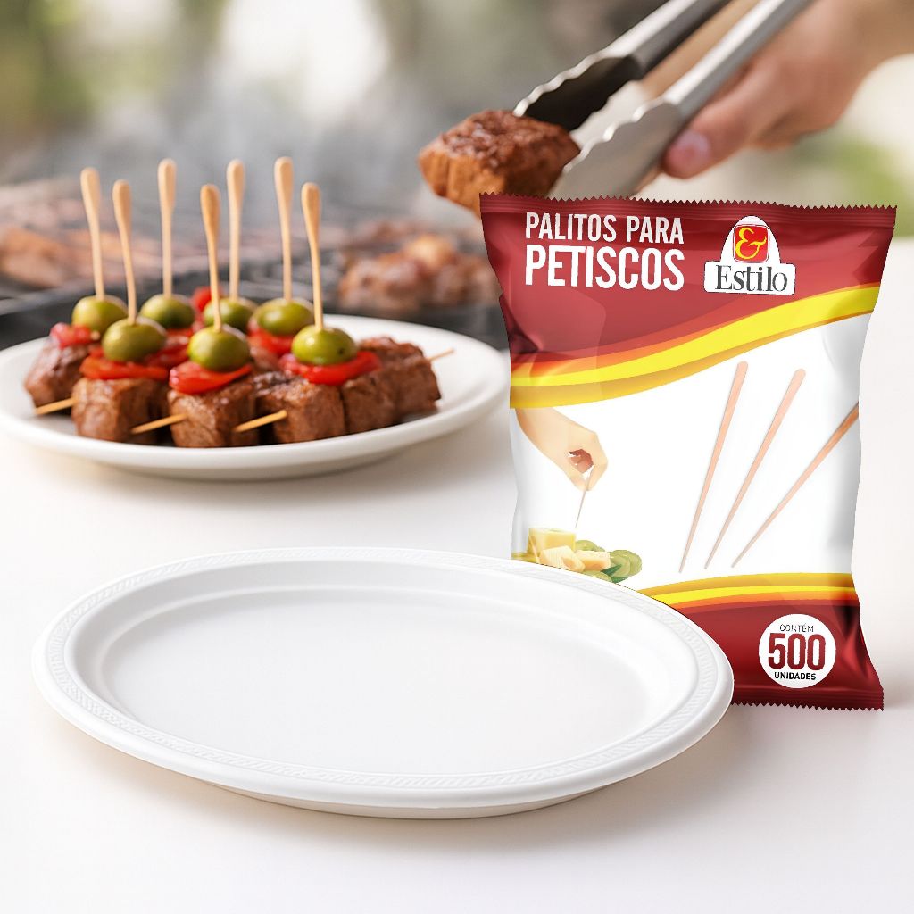 Kit 25 Bandejas Petisqueira Reforçadas 31x25cm Festa + 500 Palitos de Sanduiche 9cm Para Petisco