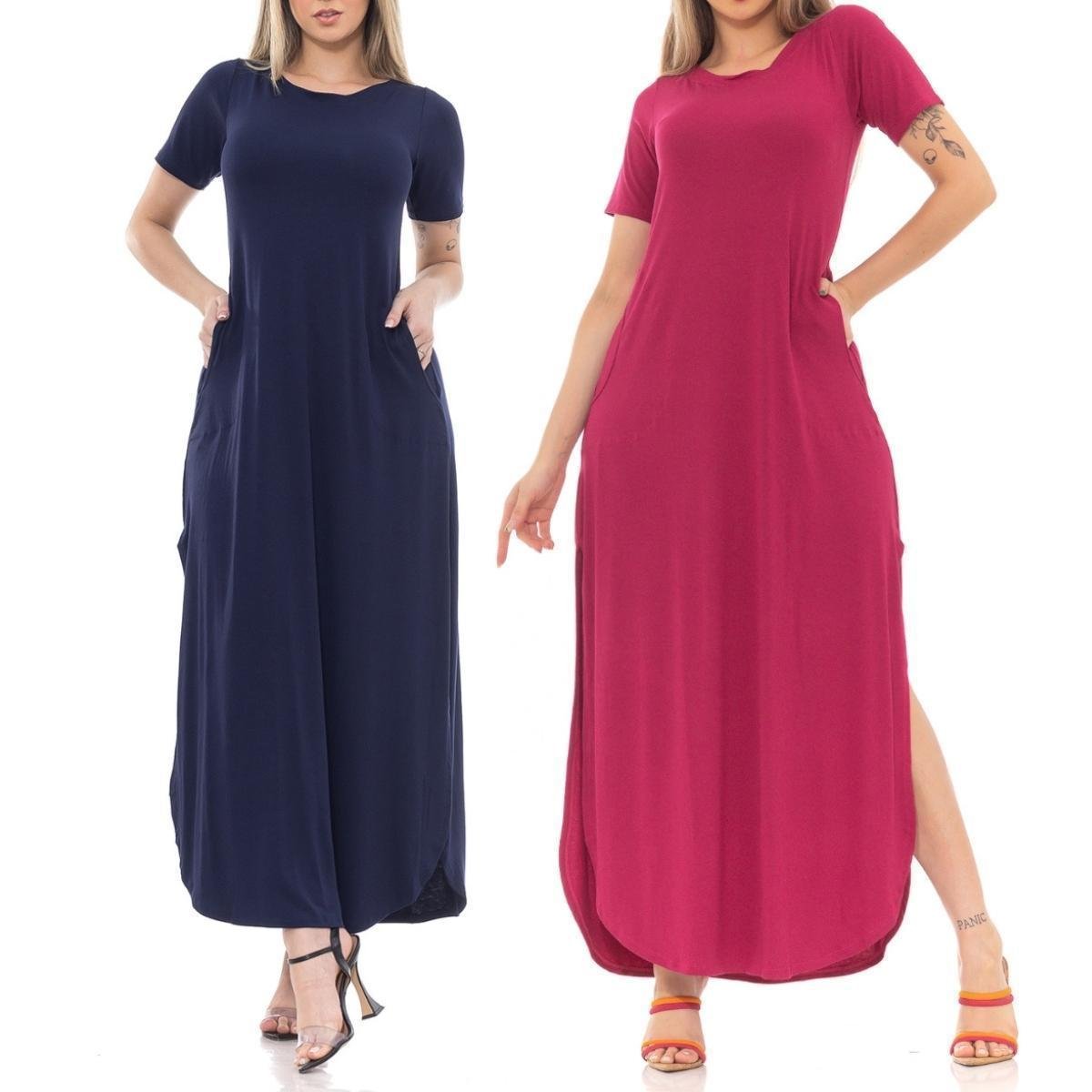 Kit 2 Vestidos Longo Premium Azul Marinho e Pink Com Fenda Lateral