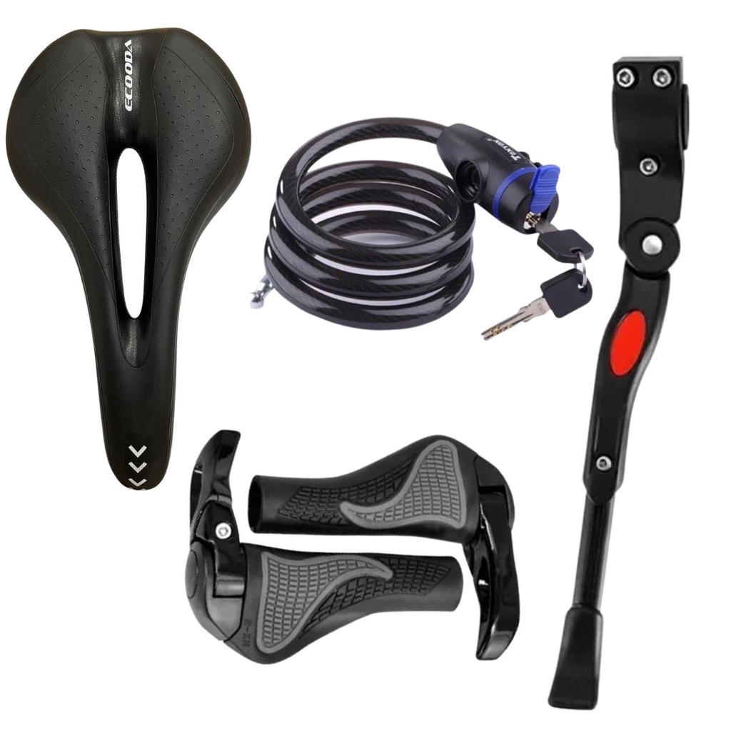 Kit de Bike 4 itens Cadeado + Pezinho Descanso Lateral + Par de Manoplas + Selim Banco Vazado em Gel