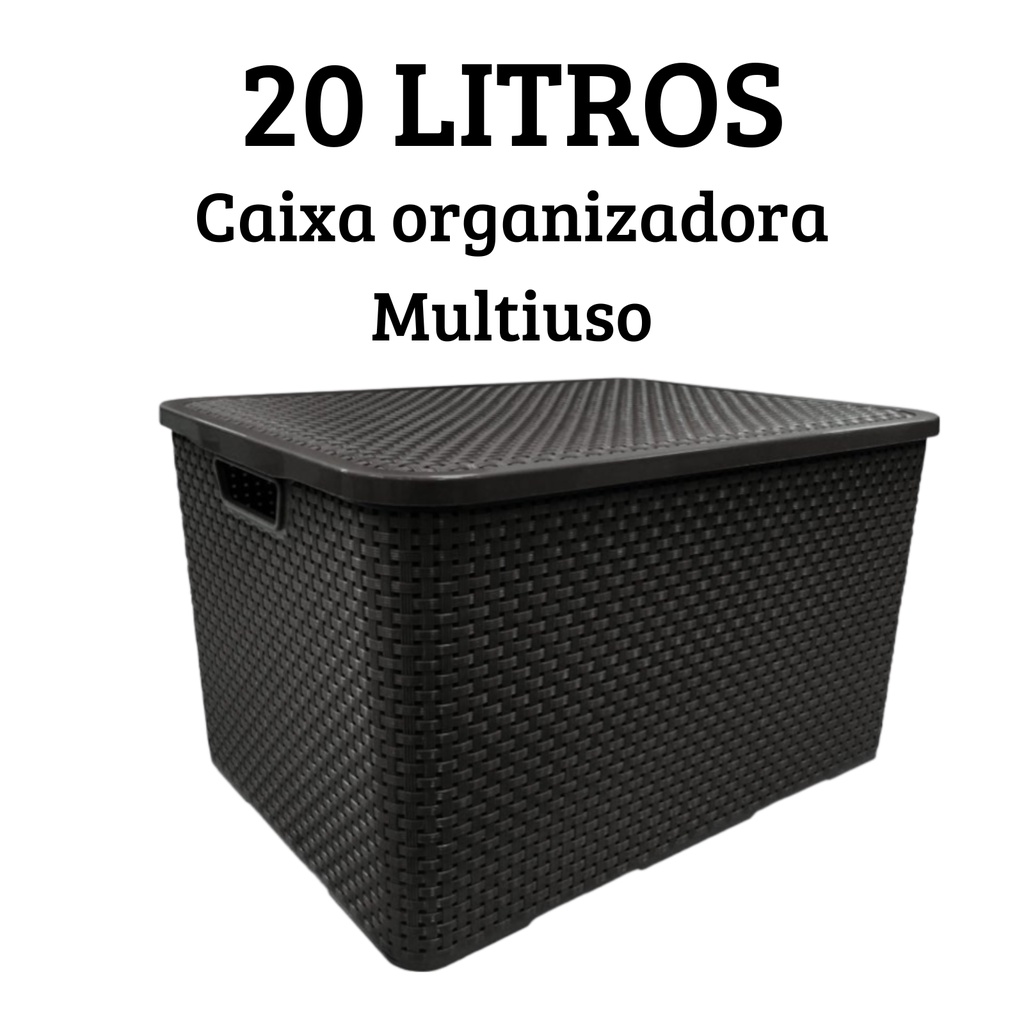 Caixa Organizadora Cesto Multiuso Rattan 20 Litros Com Tampa Preto Empilhavel Brinquedos Roupas Livros