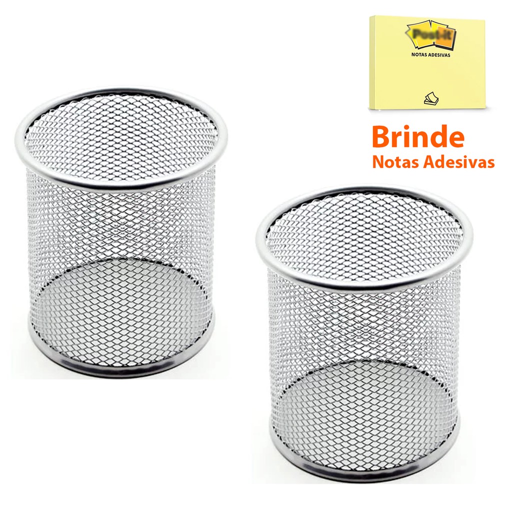 Porta Lapis Caneta Aramado Prata Redondo Kit 2 Unidades + Brinde Bloquinho de Notas