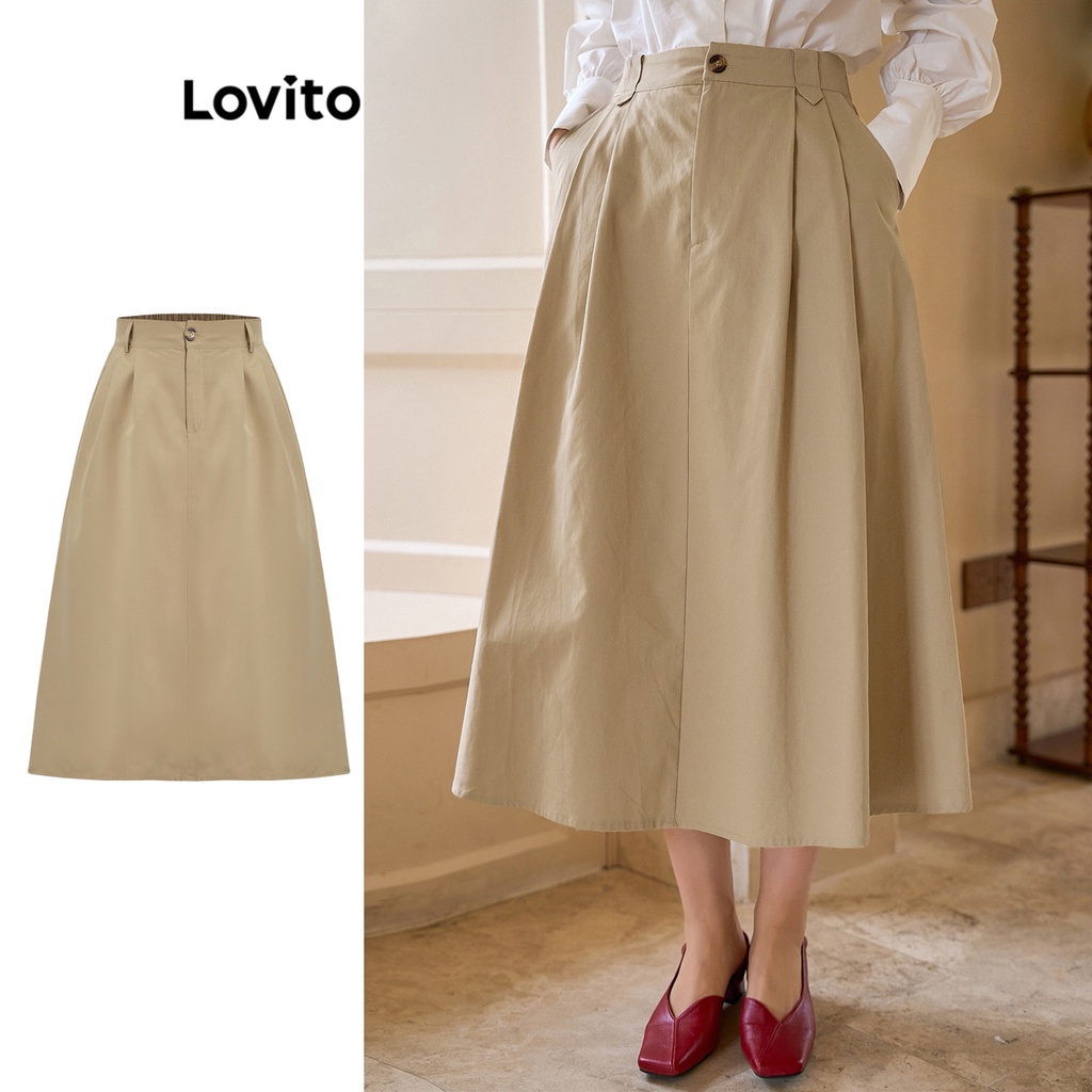 Lovito Casual Saia Feminina Lisa com Botão L58AD146 (Cáqui)