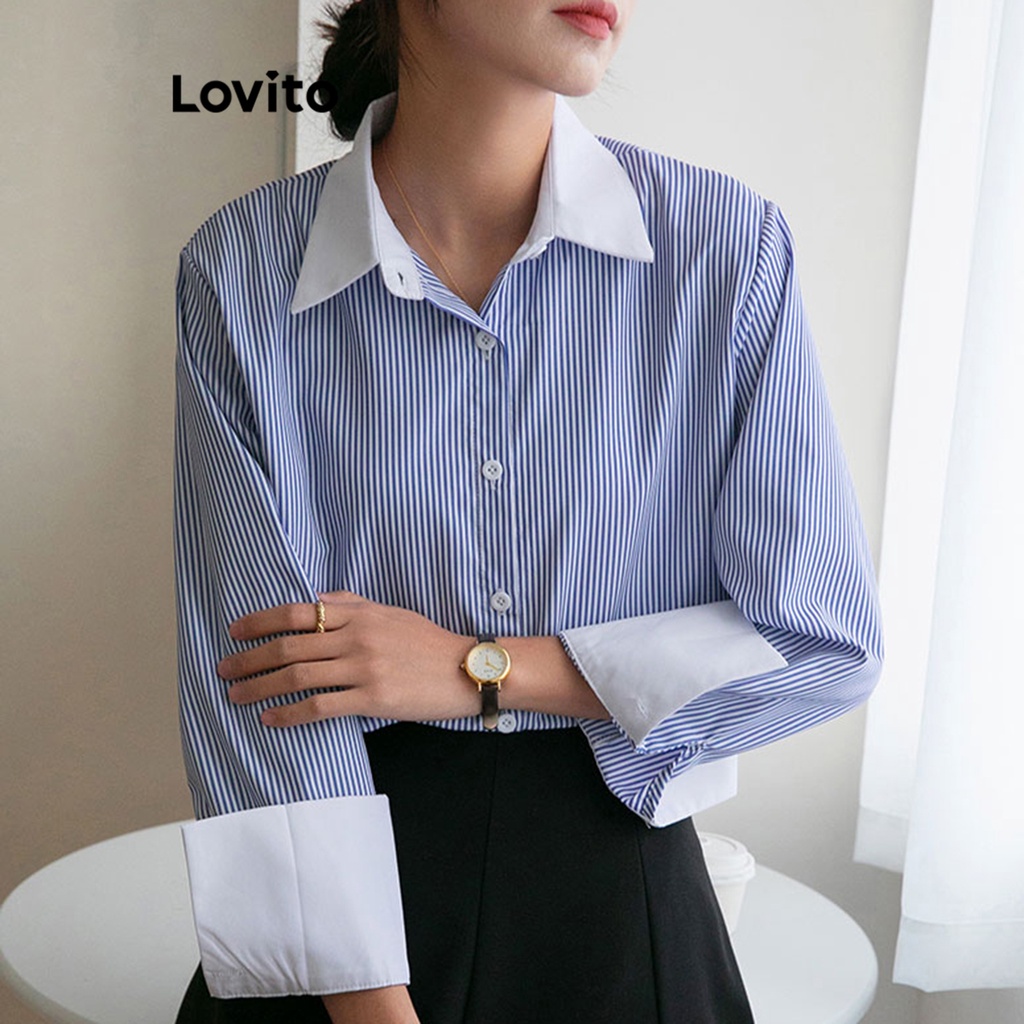 Lovito Blusa Feminina Casual Com Listras Laterais E Costura Em Tecido LNA34106 (Azul)