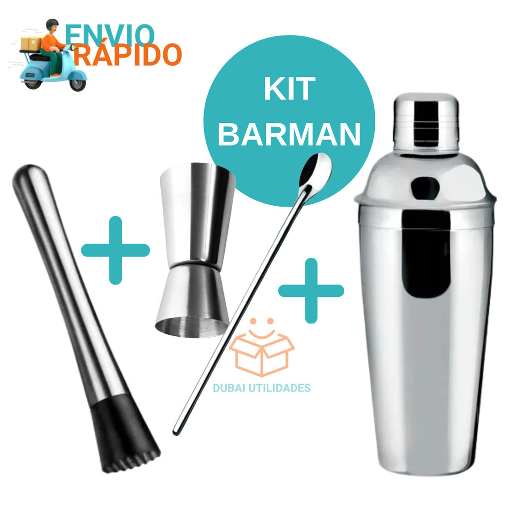 Kit Combo Bar 4 Peças Coqueteleira Alumínio socador dosador duplo e colher de suco para Bares Restaurantes