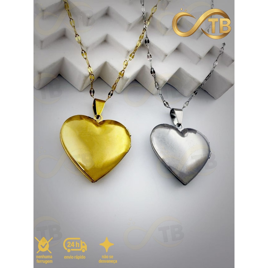 TB Colar Coração Porta-Foto Banhado a Ouro em Aço Inoxidável Hipoaérgico Feminino para Fotos