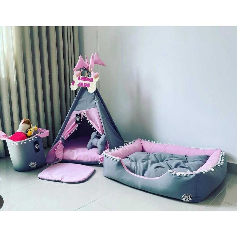 Kit Cabana Pet Completo Casinha Cama Almofada Pet Cesto Organizador Plaquinha Personalizada