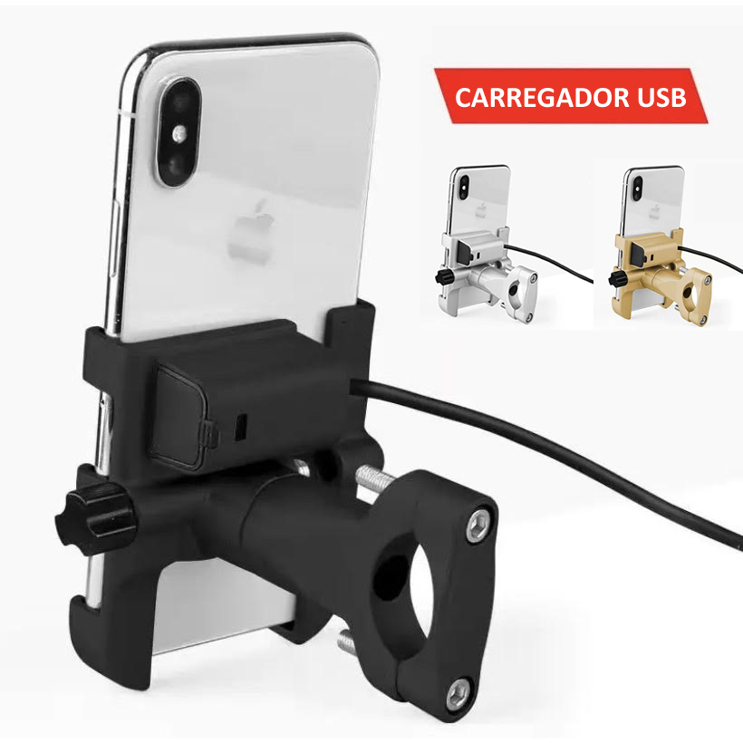Suporte de Celular Motocicleta Universal em Alumínio Com Carregador USB e Rotação de 360 Graus para Guidão