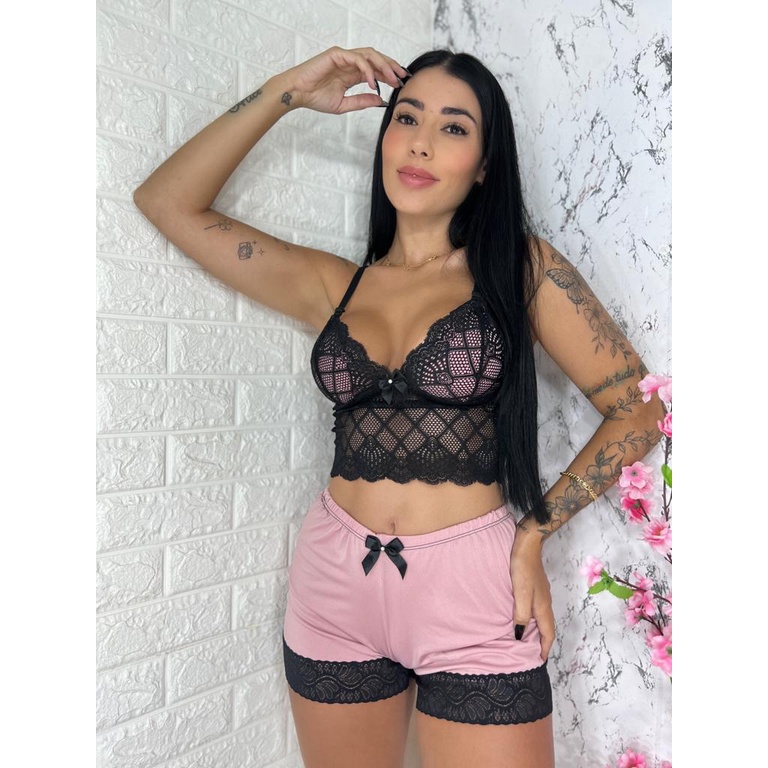 Conjunto Feminino Baby doll Short Doll Cropped Renda Sexy Pijama Com Renda Para Dormir Verão
