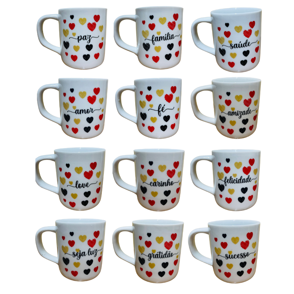 Kit 12 Xícaras temas Frases de Porcelana Primeira Linha ideal para Café Chá Presente