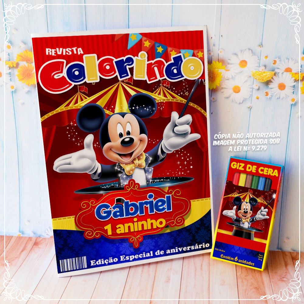 Kit Colorir Personalizado Lembrancinha Festa Revista e Giz Mickey Circo Magico Luxo