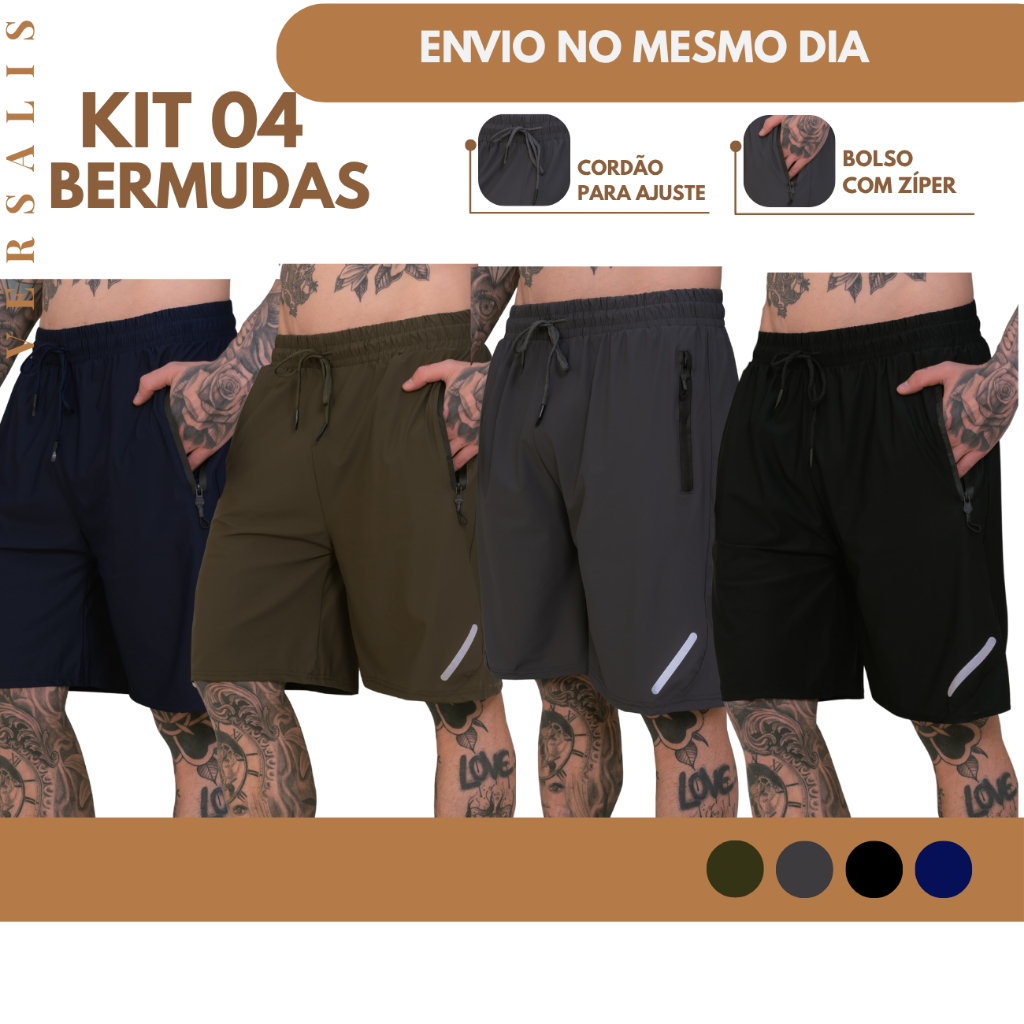KIT 04 Shorts Bermuda Masculino Poliamida Bolso com Ziper Cordao Ajustavel Elastico Uso Casual Lazer Academia Exercicio