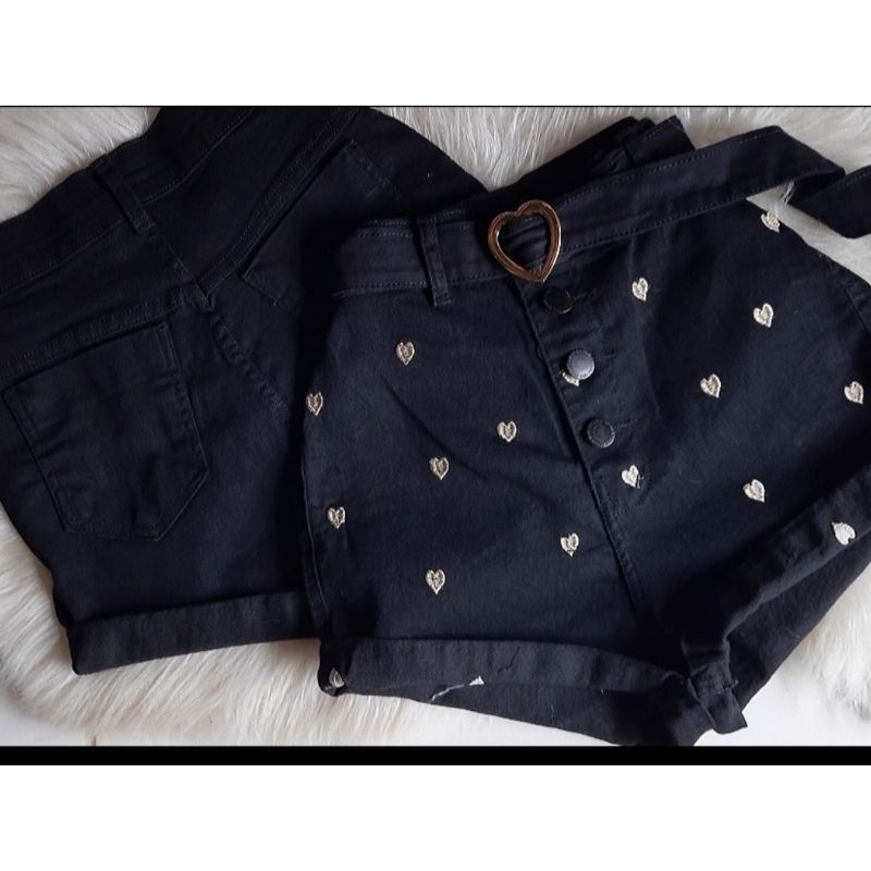 Short Jeans Lycra Feminina cintura alta botão encapado bordado cinto
