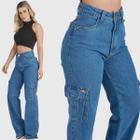 Calca feminina Jeans Wide Leg Cargo Bolso Lateral