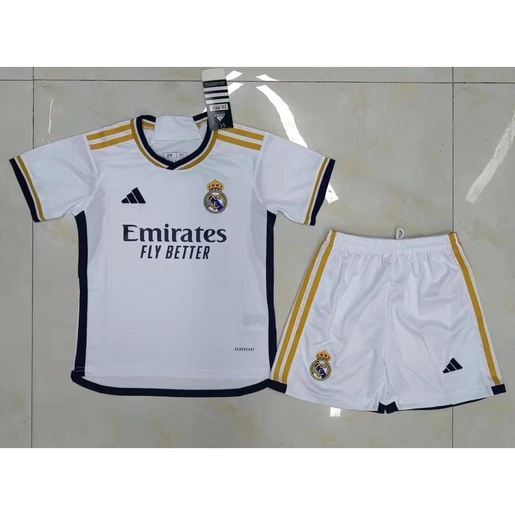 Novo 2023/2024 Infantil Kit Camisa do Time MD Home Branco Conjunto Criança Camiseta Camisa de futebol Real Madrid cr7