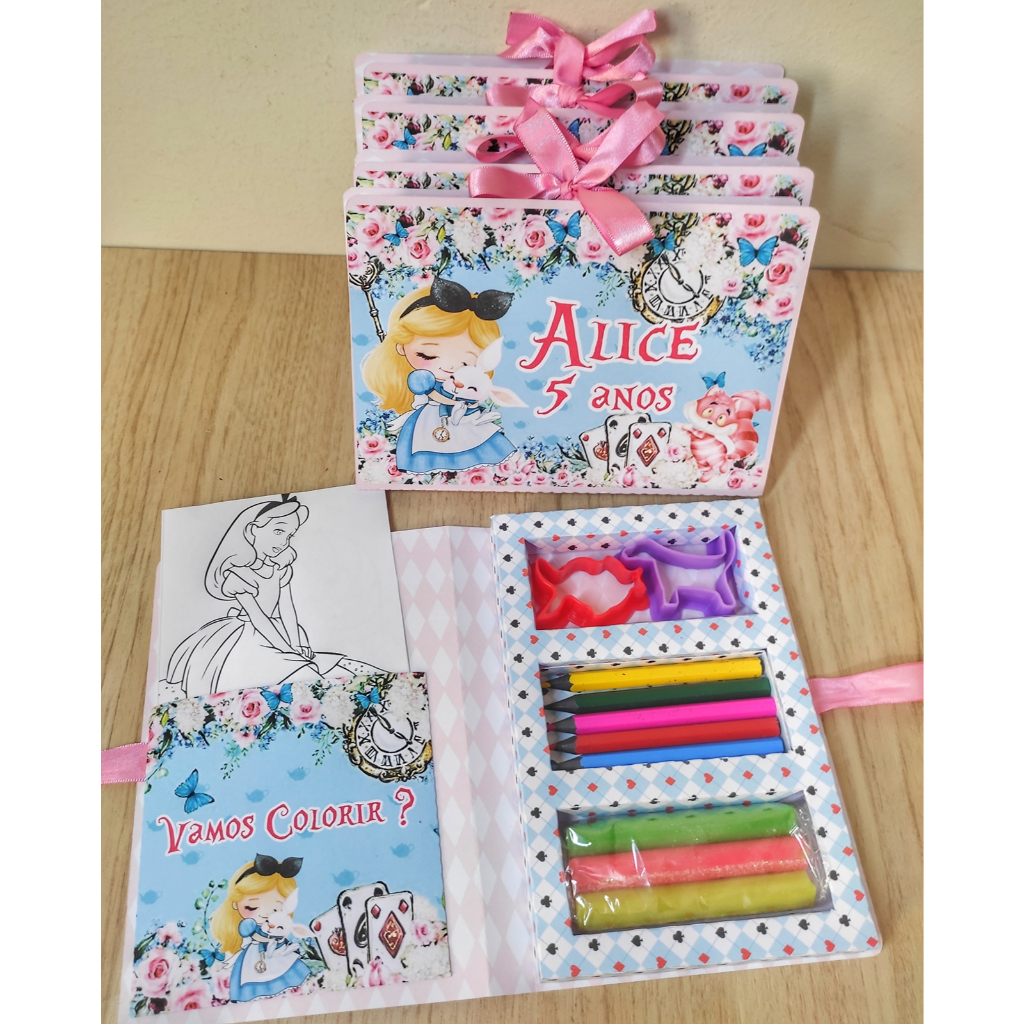 Lembrancinha Alice no País das Maravilhas - Kit Diversão com massinha de modelar e desenhos para colorir 10 unidades
