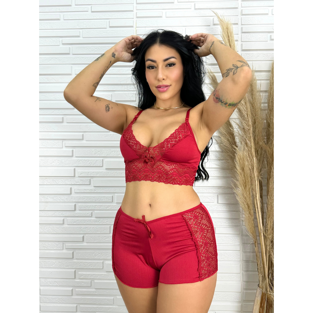 Top Doll Sexy Renda Cores Variadas Short Doll Pijama Feminino Roupa de Dormir Detalhe de Luxo