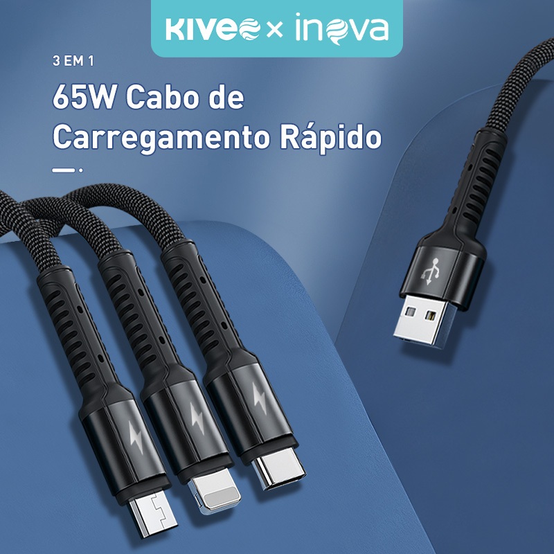KIVEE x INOVA 3 Em 1 Cabo Carregador 65W, USB Tipo C / Micro Usb / Lightning, 6A Para Samsung iPhone, 1.2M