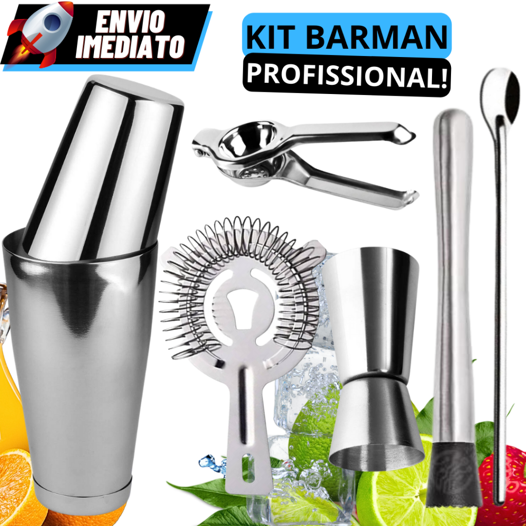 Kit Barman Coqueteleira Boston 820ml Em Aço Inox Dosador Duplo Socador de Gelo Colher de Suco Coador Inox e Espremedor de Limão Para Barmans Para Bares Caipirinha e Drinks Envio Imediato