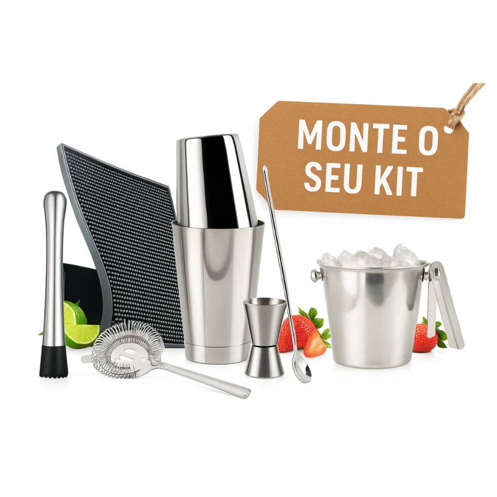 Monte Seu Kit Barman Coqueteleira Boston Profissional Aço Inox Kit Socador Espremedor Tapete BarMat